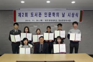대구과학대학교 영송중앙도서관은 지난26일 교내 대학본부 세미나실에서 ‘제2회 도서관 인문학의 날 시상식’을 개최했다.‘도서관 인문학의 날’은 학생들이 ‘청춘’이라는 주제로 선정된 인문학 도서를 읽고 글을 써, 20대의 나 자신을 돌아보는 시간을 갖는다.대회 결과, 강유정(아동청소년지도과,1학년)씨가 대상을 수상했으며, 최우수상에는 김지나(간호학과,1학년), 우수상 권후남(의료복지과,1학년), 장려상 김승희(유아교육과,2학년)외 4명 등 총 8명이 수상의 영예를 안았다.수상자들에게는 총 320여만원의 장학금이 지급됐다.이동성 영송중앙