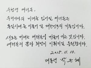 수험생 여러분,우리나라의 미래를 짊어질 여러분은통일시대를 이끌어 갈 대한민국의 기둥입니다.새로운 미래는 여러분이 만들어가는 것입니다.여러분의 꿈과 희망이 이뤄지길 응원합니다.(박근혜 대통령 페이스북에서, 2015. 11. 10)