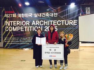 한성대학교(총장 정태원)는 지난 10월30일 인테리어디자인전공 학생들이 (사)한국실내건축가협회와 KCC가 주최한 제27회 대한민국 실내건축대전에서 대상과 우수상, 장려상, 특선, 입선등을 받았다고 11일 밝혔다.대상은 박다원 학생(11학번)이 받았고, 우수상은 이상미(11학번), 장려상은 홍설아·윤혜림·오수민(11학번), 특선에는 장영하·박세은(12학번)·전채린(10학번), 입선에는 이희명(11학번)·이다솔(12학번)·김민정(12학번)·정덕영(13학번)/김영인(12학번) 학생이 받았다.대상은 박다원 학생의 '개념의 사실주의(