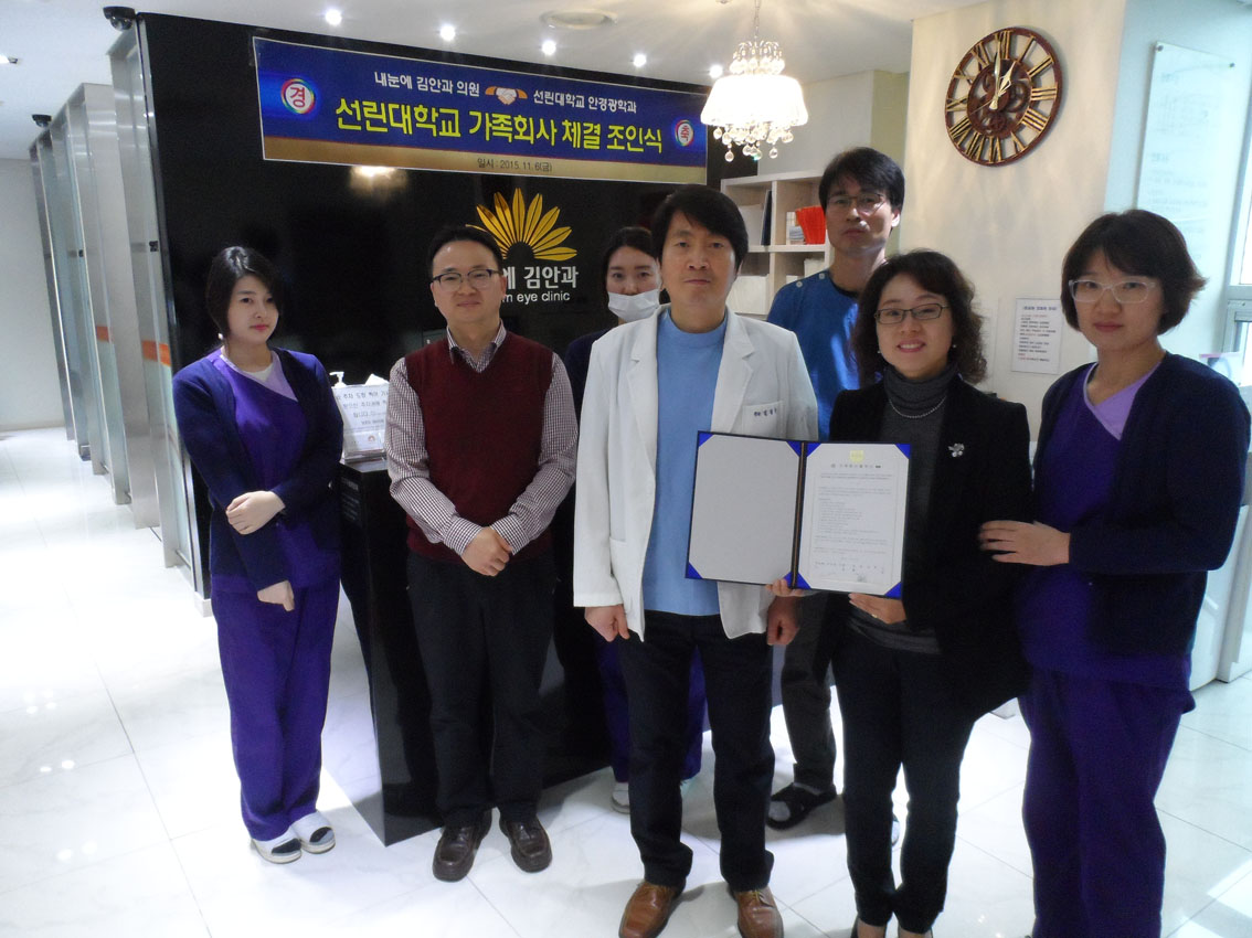 선린대학교(총장 변효철) 안경광학과는 6일 내눈에 김안과와 가족회사 체결식을 가졌다고 9일 밝혔다. 이번 체결식을 가진 내눈에 김안과(김광수 원장)는 지역민들의 눈 건강을 위해 15년 이상 꾸준히 시력교정클리닉, 노안수술클리닉, 눈 성형 클리닉을 실시하고 있다.