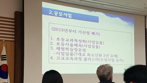 이날 협의회는 사실상 초등돌봄과 초등교과특성화, 초등자율체육, 체험학습장 운영, 고교교육과정 클러스터 등에 대한 내년 가산점 폐지를 설명하는 안내하는 자리였다.