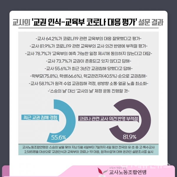 교사노조는 “교육부와 교육청의 교사 경시, 현실성 없는 정책과 관행적 업무 지시는 변하지 않고 있다”며 “코로나19에 대한 교육부의 대응에 대한 교사의 부정적 평가는 이를 여실히 보여주고 있다”고 지적했다.