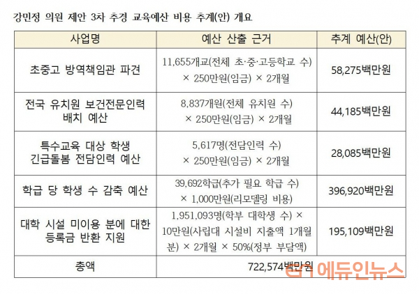 강 의원은 “3차 추경안에 학생의 생명과 안전을 지키고 교육권을 보장하는 예산이 추가돼야 한다”며 ▲학교 방역책임관 파견 예산 책정 ▲전국 유치원 보건전문인력 배치 예산 확보 ▲특수교육 대상 학생의 교육소외 최소화 위한 전담인력 배치 등 예산 책정 ▲학급당 학생 수 20명 이하 감축 ▲유치원과 학교 방역 강화를 위한 학교 방역체계 확보용 긴급교육지원예산 책정 ▲대학시설 미이용 분에 대한 등록금 반환 지원금 지급 등 예산 반영을 촉구했다.