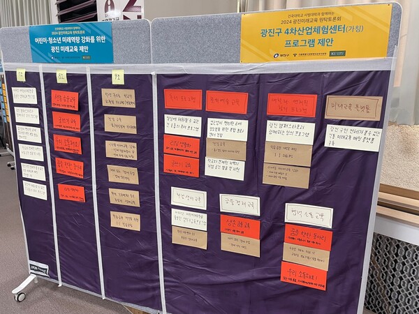 토론회는 크게 세 가지 주제로 나뉘어 진행되었습니다. 교육 격차 해소 방안, 현장 체험 학습 지원 방안, 광진 미래 교육 제안을 주제로 팀 별로 아이디어를 도출하며, 각 주제에 대해 포스트잇에 주요 결과와 제안 사항들을 공유하는 시간을 가졌습니다.