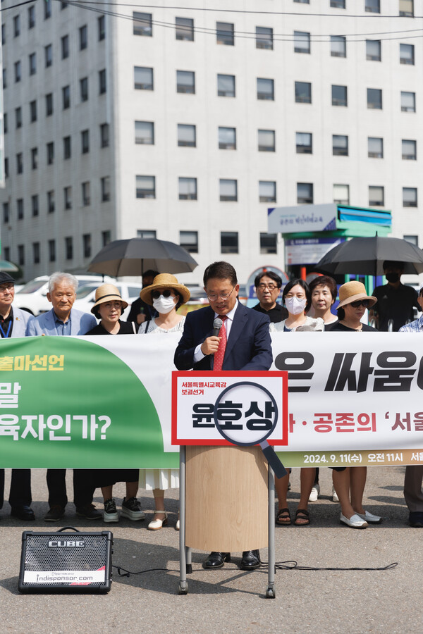 윤호상 예비후보는 9월 11일 오전 서울시교육청 앞에서 서울시교육감 보궐선거 출마를 공식 선언했다. 그는 서울교육의 문제 해결에 있어 현장 경험이 필수적임을 역설하며, 자신의 교육 현장 경험을 바탕으로 한 실질적 개혁을 약속했다.