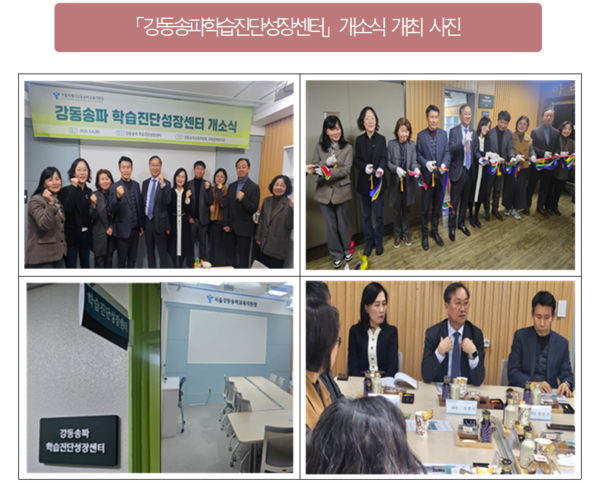 서울특별시강동송파교육지원청(교육장 조현석)은 3월 5일(수) 강동송파학습진단성장센터 개소식을 개최했다. 올해 강동송파교육지원청은 정근식 교육감 취임 후 1호 결재 사업인 서울학습진단성장센터 운영 시범청으로 지정되었다. 이번 개소식은 강동송파학습진단성장센터의 본격적인 출범을 알리는 자리로 마련되었다.