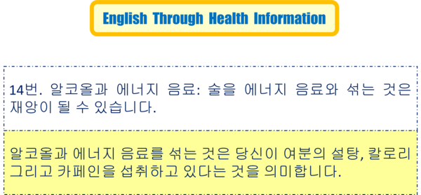 이전 기사보기 다음 기사보기 박병태 교수의 유닛영어: 함께 먹으면 해로운 음식들 [14. 술과 에너지 음료] 스크롤 이동 상태바 현재위치 노출 박병태 교수의 유닛영어: 함께 먹으면 해로운 음식들 [14. 술과 에너지 음료] 입력 2025.06.30 11:38 수정 2025.07.03 21:06 글자 크기 본문 글씨 키우기 본문 글씨 줄이기 프린트 인쇄하기 SNS 기사보내기 페이스북(으)로 기사보내기 트위터(으)로 기사보내기 카카오스토리(으)로 기사보내기 카카오톡(으)로 기사보내기 구글+(으)로 기사보내기 네이버밴드(으)로 기사보내기 네이버블로그(으)로 기사보내기 핀터레스트(으)로 기사보내기 URL복사(으)로 기사보내기 다른 공유 찾기 [에듀인뉴스(EduinNews) = 인터넷뉴스팀 ] 추천0반대0 저작권자 © 에듀인뉴스(EduinNews) 무단전재 및 재배포 금지 개의 댓글 회원로그인 작성자 비밀번호 댓글 내용입력 댓글 정렬 최신순 추천순 답글순 BEST댓글 BEST 댓글 답글과 추천수를 합산하여 자동으로 노출됩니다. 닫기 더보기 댓글삭제 삭제한 댓글은 다시 복구할 수 없습니다. 그래도 삭제하시겠습니까? 비밀번호 닫기 댓글수정 댓글 수정은 작성 후 1분내에만 가능합니다. 본문 / 400 비밀번호 닫기 내 댓글 모음 닫기