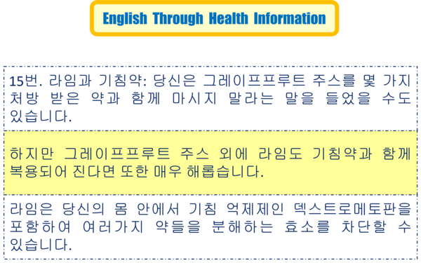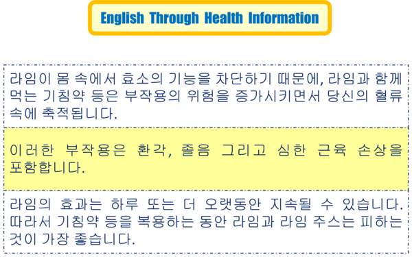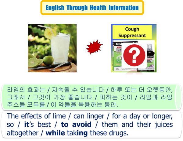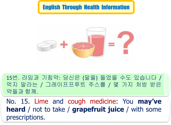 이전 기사보기 다음 기사보기 박병태 교수의 유닛영어: 함께 먹으면 해로운 음식들 [15. 라임과 기침약] 스크롤 이동 상태바 현재위치 노출 박병태 교수의 유닛영어: 함께 먹으면 해로운 음식들 [15. 라임과 기침약] 입력 2025.07.03 11:27 수정 2025.07.03 21:03 글자 크기 본문 글씨 키우기 본문 글씨 줄이기 프린트 인쇄하기 SNS 기사보내기 페이스북(으)로 기사보내기 트위터(으)로 기사보내기 카카오스토리(으)로 기사보내기 카카오톡(으)로 기사보내기 구글+(으)로 기사보내기 네이버밴드(으)로 기사보내기 네이버블로그(으)로 기사보내기 핀터레스트(으)로 기사보내기 URL복사(으)로 기사보내기 다른 공유 찾기 [에듀인뉴스(EduinNews) = 인터넷뉴스팀 ] 추천0반대0 저작권자 © 에듀인뉴스(EduinNews) 무단전재 및 재배포 금지 개의 댓글 회원로그인 작성자 비밀번호 댓글 내용입력 댓글 정렬 최신순 추천순 답글순 BEST댓글 BEST 댓글 답글과 추천수를 합산하여 자동으로 노출됩니다. 닫기 더보기 댓글삭제 삭제한 댓글은 다시 복구할 수 없습니다. 그래도 삭제하시겠습니까? 비밀번호 닫기 댓글수정 댓글 수정은 작성 후 1분내에만 가능합니다. 본문 / 400 비밀번호 닫기 내 댓글 모음 닫기