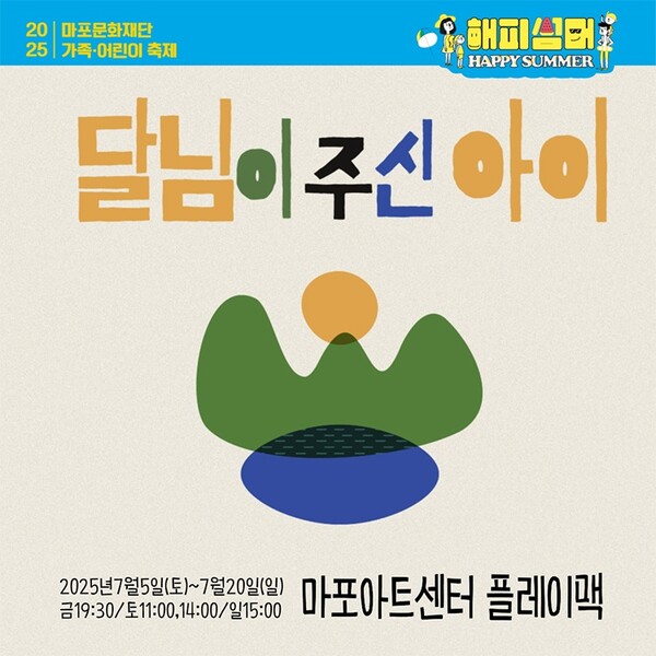 마포문화재단이 2025년 여름을 맞아 가족과 어린이를 위한 특별한 공연 <달님이 주신 아이>를 선보인다. 공연은 7월 5일부터 7월 20일까지 마포아트센터 플레이맥에서 진행된다.
