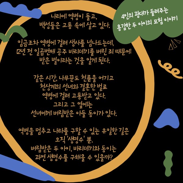 극 중 바리데기는 일곱 번째 공주로 태어났으나, 왕으로부터 버림받아 역병을 멈출 수 있는 생명수를 찾기 위한 여정을 떠난다. 한편, 천상계 선녀와 나무꾼 사이에서 태어나 버림받은 아이 동이도 천륜을 어긴 죄로 역병에 걸린 아버지 나무꾼을 구하기 위해 모험을 시작한다. 공연은 이 두 아이가 만나 힘을 합쳐 역경을 이겨내는 이야기를 담았다.