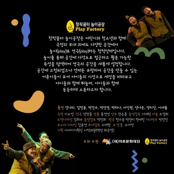 창작꿈터 놀이공장(Play Factory)이 제작한 이번 공연은 어린이와 청소년이 함께 놀이와 연극을 통해 창의력을 키우고, 어른들과 아이들이 함께 소통할 수 있는 특별한 문화 경험의 장이 될 것으로 기대된다.