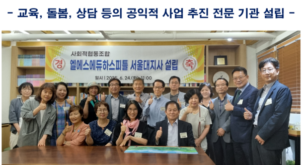 사회적협동조합 엘에스에듀하스피틀(이하 “엘에스에듀”, 이사장 조석원)은 2025년 6월 24일 엘에스에듀 서울대지사 개소식을 개최했다. 엘에스에듀는 2019년 교육부의 인가를 받은 사회적협동조합으로 교육, 돌봄, 상담을 주요 활동으로 하고 있으며, 서울 조직을 확대하고자 이번에 서울대역 인근에 지사를 설립하고 개소식을 하였다.
