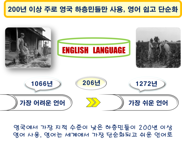 프랑스어에 사실상 국어(國語)의 자리를 내어준 영어는 교육 수준과 지적 수준이 가장 낮은 사람들이 주로 사용하는 언어로 전락했다. 그때부터 영어는 사용자의 수준에 맞게 단순화되기 시작했다. 그러한 기간이 무려 200년이 넘는다.