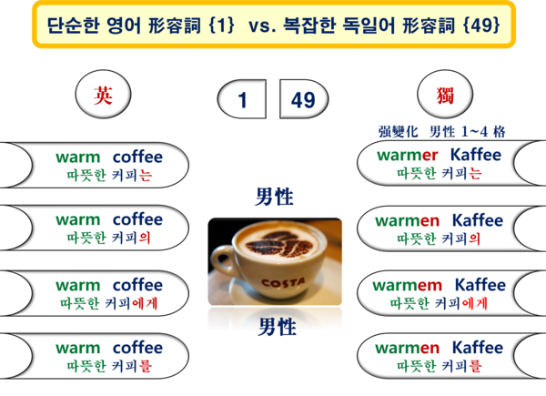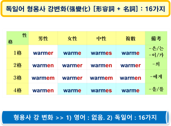 명사의 性․數․格에 따라 최대 48가지의 변화형을 가지는 독일어의 형용사는, 기본형인 형용사를 포함하면, 똑같은 의미를 가진 형용사 1개가 최대 49개의 다른 모습을 가지게 되지만, 영어의 경우에는 형용사가 변화하는 경우는 없다. 영어의 비교급에서 ‘warm’이 ‘warmer’로 변한 경우는 ‘따뜻한’이라는 뜻을 가진 형용사가 ‘더 따뜻한’이라는 뜻을 가진 다른 단어로 변화한 경우이고, 형용사의 수식을 받는 명사의 性․數․格에 따른 변화는 아니다.