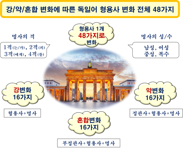 명사의 性․數와 格에 따라 변화하는 독일어의 기본 형용사 또는 원형(原型) 형용사 1개는, 강변화(强變化) 16가지, 약변화(弱變化) 16가지, 혼합변화(混合變化) 16가지 등 총 48가지로 변화하기 때문에, 최대 48가지의 변화형을 가지게 된다.
