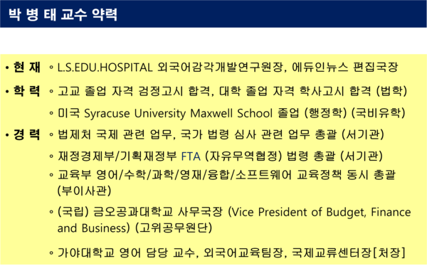 박병태 교수는 자기 주도 학습에 의한 졸업 자격시험으로 대학 과정까지 마쳤고, 대학원 과정은 국비유학으로 미국에서 정규 학교를 다녔습니다. 전공은 법학과 행정학이었지만, 교육부에서 국가 영어교육정책을 총괄하고, 대학에서 영어를 가르쳤습니다. 영어, 러시아어, 프랑스어, 독일어, 스페인어, 일본어, 중국어, 베트남어, 인도네시아어, 우즈베키스탄어 등 다양한 외국어에 대한 특별한 관심과 비교언어학(比較言語學) 위주의 연구 결과 덕분에 가능했던 일이었습니다. 나아가 15년 이상 언어의 습득과 사용을 주제로 뇌(腦) 연구를 하여 다양한 영어학습과 영어교육 이론들을 개발하였습니다. 지금부터 연재되는 이론을 통해 영어 등 외국어를 학습하거나 교육하는 우리 국민들이 자신의 외국어 학습법이나 교육방식과 박병태 교수의 이론을 흥미롭게 비교할 수 있는 계기가 되기를 기원합니다.