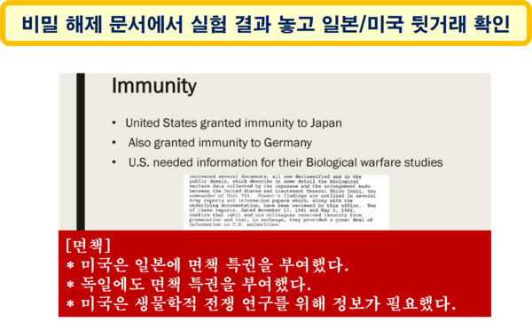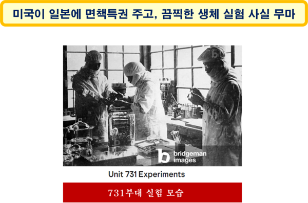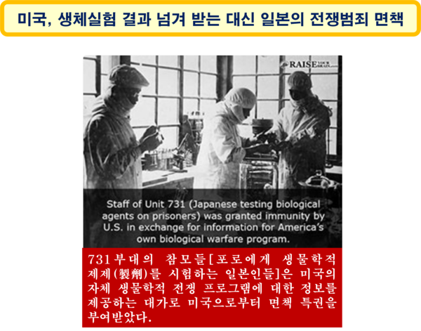 그러나 일본이 항복한 후 미국은 비밀부대의 지도자들에게 면책특권(免責特權)을 부여하고, 전쟁포로와 남성, 여성, 어린이, 심지어 유아를 포함한 민간인에 대한 일본의 끔찍한 실험에 관한 사실을 미국이 무마했다.