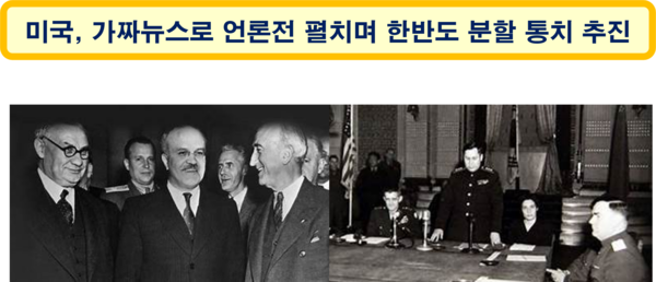 이미 언급한 바와 같이 미국은 생체실험 결과 등을 대가로 일본에 전쟁범죄에 대한 면책특권을 주었고, 일본을 분할 통치하기로 한 연합국의 의도를 미국이 무산시켰다. 나아가 소련은 조선의 신탁통치를 주장하고 미국은 조선을 신속하게 독립시키기를 원한다는 가짜뉴스까지 만들어 전파하면서 미국이 한반도 분할 통치를 강행했다. 이 과정에서 한반도의 55%를 소련에 서둘러 넘겨버린 것은, 소련이 일본을 분할 통치하자고 할 것이 두려워 소련의 요청을 사전에 차단하기 위한 미국의 전략적인 조치로 생각된다.