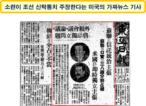 동아일보 등 국내 언론들은 미국 기사를 받아 12월 27일자로 '소련은 조선 신탁통치 주장, 미국은 조선 즉시 독립 주장, 신탁통치에 대한 소련의 구실은 38선 분할 점령”이라는 내용의 기사를 냈다. 다음 해인 1946년 1월 24일 소련이 타스통신(ТАСС)을 통하여 모스크바 3상 회담의 경과와 ‘한반도 신탁통치안의 원래 제안자가 미국’이라는 사실을 공개함으로써 미국발 기사 내용이 의도적으로 조작된 오보(誤報)임이 밝혀졌다.