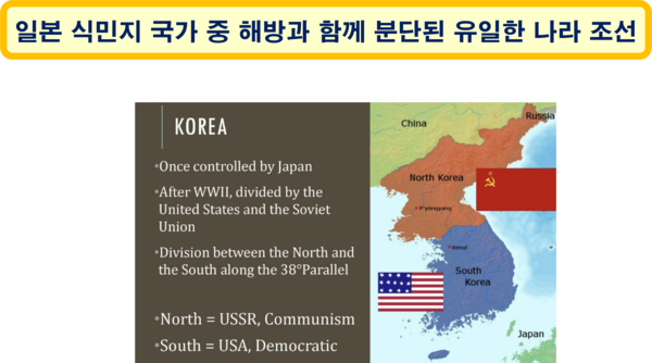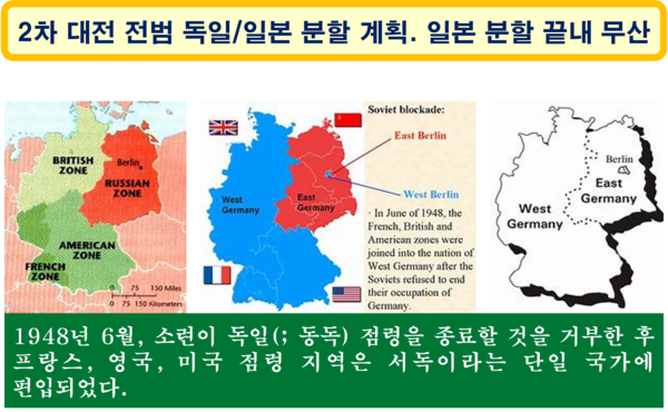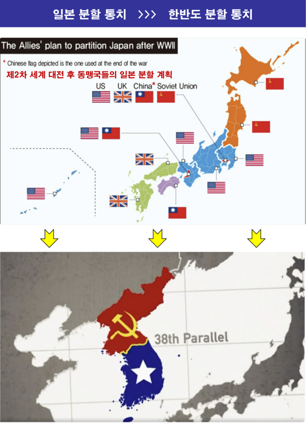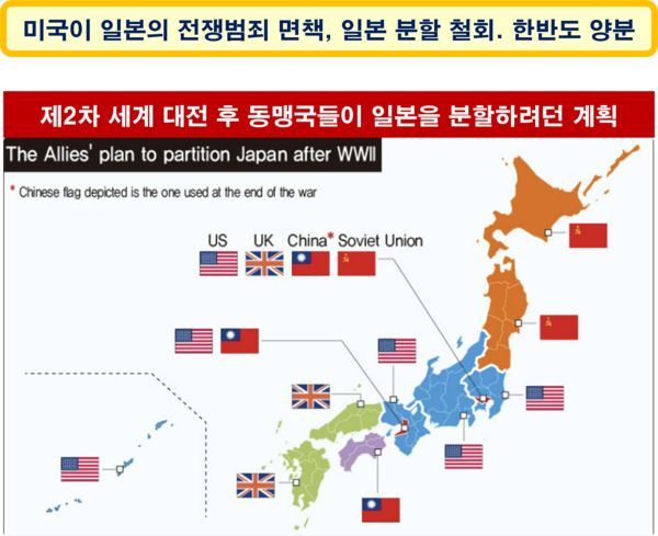 연합국은 제2차 세계 대전을 일으킨 책임을 물어 유럽에서는 독일을 분할시킬 것을 결의(1945.2.4. 얄타 회담)했고, 아시아에서는 일본을 분할시킬 예정이었다. 그런데 2차 대전의 일부가 되었던 태평양전쟁(1941~1945)을 일으킨 일본은 미국의 반대로 끝내 분할되지 않았다.