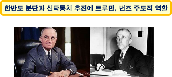 32대 프랭클린 루스벨트 대통령의 갑작스런 죽음(1945.4.12)으로 대통령직을 승계한 트루만(Harry S. Truman) 부통령과 당시 국무장관이었던 번즈가 조선의 분단과 신탁통치에 주도적인 역할을 수행했다. 이들은 한반도 신탁통치는 소련이 주장하였고, 미국은 이를 저지하기 위해 노력하고 있다는 가짜뉴스를 만들어 언론에 전파하기도 했다.