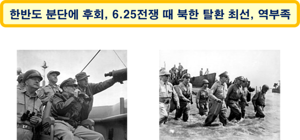 분할 5년도 되지 않아 동족 간에 처절한 전쟁이 발발하자, 맥아더는 한반도 분단에 대한 자신의 역할을 크게 후회하며, 인천 상륙 작전(1950.9.15)을 통해 압록강과 두만강까지 진격하는 등 북한 탈환과 한반도 통일을 위해 혼신의 노력을 다했으나, 중공군의 개입(1950.11)으로 간신히 남한을 방어하는데 그치고 말았다.