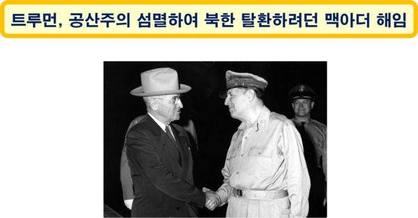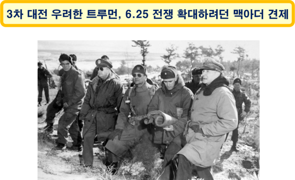 6·25 전쟁은 무조건 한반도 내의 국지전이 되어야만 한다는 생각을 가진 미국 대통령 트루먼 입장에서는 자꾸 전쟁을 키우려고 하는 맥아더가 굉장히 위험한 인물로 인식되었다. 당시 맥아더는 중국에 원자폭탄을 투하하고 장제스와 함께 중국 해안에 상륙하자는 작전을 구상했다고 한다. (출처: 나무위키)