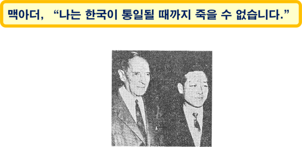1962년 10월 미국을 방문 중이던 김종필 전 총리와의 면담에서 맥아더는 "한국이 하루빨리 통일이 되기를 바랍니다. 나는 한국이 통일될 때까지 죽을 수 없습니다."라고 말했다. 또 맥아더는 김종필에게 "한국 전쟁을 승리로 이끌기 위하여 만주 폭격을 주장"했으며 "한국 전쟁의 휴전에 있어서 미국은 잘못을 저질렀습니다.“라고 했다. (원문: 위키백과)