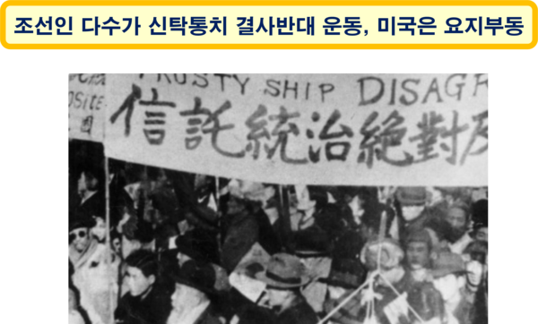 처음부터 조선인 참여가 제한된 5년 신탁통치안을 제시하였던 미국은 신탁통치 기간 중에도 조선인의 정치 참여를 철저히 배제하려고 했다. 조선인들이 신탁통치 결사반대를 외쳤지만, 한반도 분할 통치라는 미국의 단호한 결정을 되돌릴 수는 없었다.