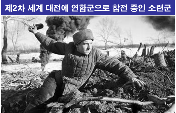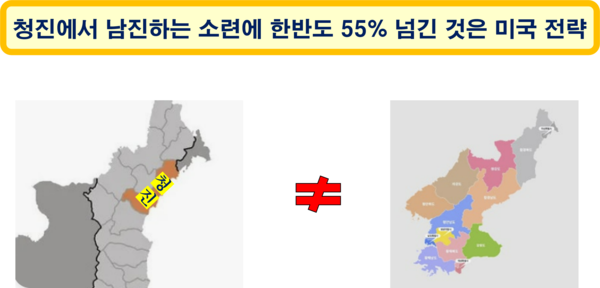 2차 대전 막바지에 만주와 한반도에 주둔하고 있던 일본군을 몰아내달라는 미국의 요청을 받은 연합국 소련은 만주 지역의 일본군을 몰아낸 데 이어 1945년 8월 13일 함경북도 청진에서 일본군과 전투를 벌여 8월 15일 청진시를 점령하였다. 그날 소련군은 일본이 항복한 사실을 알고도 남진하였고, 이에 미국은 한반도 전체를 소련이 점령하려 한다고 주장하며, 38선 북쪽은 소련군이 주둔하고, 남쪽은 미군이 주둔하기로 합의하면서 남북 분단(1945.8.26.)이 초래되었다는 것이었다.