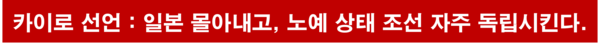 3) 또한 일본은 폭력과 탐욕으로 약탈한 다른 일체의 지역으로부터 구축(驅逐)될 것이다. 앞의 3대국은 조선민의 노예 상태에 유의하여 적당한 시기에 조선을 자주 독립시킬 결의를 한다.