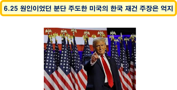 올해(2025년) 7월 미국의 트럼프(Donald J. Trump) 대통령은 미국이 한국을 재건했다고 말했다. 미국이 전범 국가 일본의 분할 통치를 막아 주기 위한 방편으로 무고한 한반도를 갈라놓았고, 그 결과 6.25 전쟁이 발발하여 한반도 전역이 재기 불능의 폐허가 되었다. 한국이 경제발전을 위해 악전고투를 하고 있을 때 미국이 도움을 준 것은 사실이지만, 그렇다고 미국이 한국을 재건하였다고 당당하게 말할 수 있겠는가?
