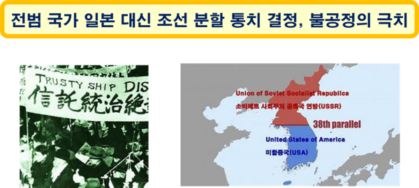 어쨌든 미국의 한반도 분할 통치 결정은 매우 불공정하고 불공평한 조치였다. 조선은 제2차 세계 대전이 시작될 때부터 끝날 때까지 전쟁에 대하여 책임을 져야 할 어떠한 행위도 하지 않았기에, 조선으로 하여금 신탁통치를 받게 하는 것은 지극히 불공정한 결정이었다. 나아가 일본의 식민지로 고통을 받았던 다수의 아시아 국가들 중에 조선이 가장 오랫동안 고통을 받았는데, 조선만이 영토 분할에 의한 신탁통치를 받게 하였던 조치 또한 지극히 불공평한 결정이었다.