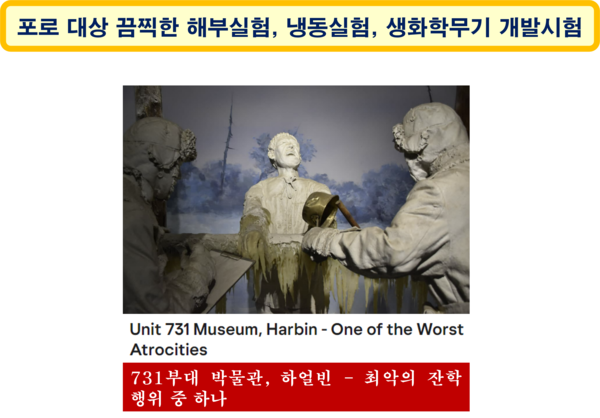 그곳에서 일본군 제731부대는 남녀노소 포로들을 상대로 해부 실험, 냉동실험은 물론 탄저균(炭疽菌) 등 치명적인 세균을 활용한 생화학 무기 개발 시험을 했다. 탄저균으로 발병하는 탄저병(炭疽病)은 내장이 붓고 혈관에 균이 증식하는 병으로, 소, 말, 양 등 초식 가축에 주로 발생하며, 사람에게 옮기기도 한다.