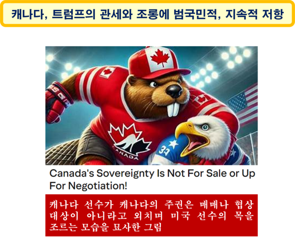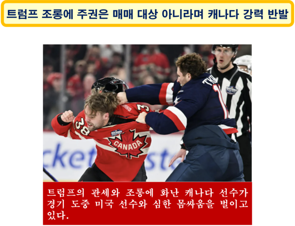 트럼프는 G-7 국가이면서 미국과는 공동 방위를 하는 이웃 캐나다에 고율의 관세 폭탄과 함께 미국의 51번째 주가 되라는 진심이 섞인 조롱을 여러 차례 한 바 있다. 이에 캐나다 국민은 국가의 주권은 판매나 협상의 대상이 될 수 없다며 미국을 향해 강하게 반발하고 있다. 지난(2025년) 2월 15일에는 미국과 캐나다의 아이스하키 시합 도중 트럼프의 높은 관세와 조롱으로 분노한 캐나다 선수들이 미국 선수들과 심한 몸싸움을 벌이기도 했다.