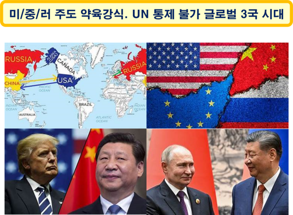 세계를 위협하는 트럼프에 질세라 시진핑은 미국 보란 듯이 세계 정복 야욕을 드러내며 주변 약소국을 노골적으로 흡수하려는 모습을 보이고 있고, 푸틴은 선제공격을 하고서도 자신이 원하는 땅을 내어주지 않으면 휴전을 하지 않겠다는 압박을 하고 한다. 지금 국제사회에는 국가 사이에 협박이 난무하는 약육강식의 위협적인 상황이 전개되고 있고, 미국, 중국, 러시아를 제외한 국가들은 약소국이 되어버린 느낌마저 들 정도로 세계는 3국 중심으로 전개되고 있다.