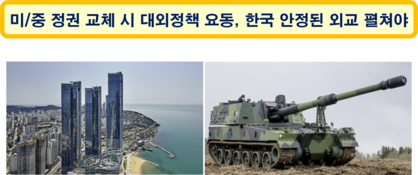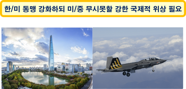 특히 미국과 중국의 패권 다툼 속에서 한국이 미국이나 중국을 상대로 비굴하지 않게 살아가기 위해서는, 한국 지도자의 개인적인 자질, 성향, 언행 등에 의한 국가 이미지의 대외적 손상을 최소화하는 한편, 미국에게는 굳건한 동맹, 중국에게는 함부로 할 수 없는 이웃이라는 인식을 주면서 치밀하고 안정된 외교 전략을 펼쳐야 한다. 미국은 한국 없이는 중국을 상대하기 어렵고, 중국은 한국 없이는 미국을 이기기 어렵다는 상황을 두 나라가 잘 알고 있다. 따라서 한국은 미국과의 동맹 관계를 더욱 강화하면서, 지속적으로 경제력과 군사력를 보강함으로써, 중국은 물론 미국도 한국을 무시할 수 없는 세계적인 위상을 유지할 수 있어야 한다.