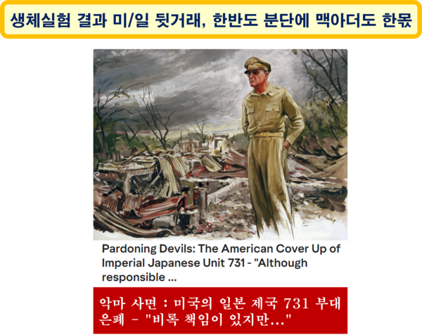일본의 생체실험 성과물을 미국이 활용하는 대가로 일본에 전쟁범죄 면책특권을 주고, 일본 영토 분할 통치를 기대했던 러시아에는 한반도를 양분하여 넘기는 일에 맥아더(1880~1964)도 적지 않은 역할을 했다. 이러한 맥아더의 역할은 "동맹국은 자국을 위하여 어떠한 이익도 요구하지 않는다."는 카이로 선언(1943.11.27)을 정면으로 위반한 것이 된다.