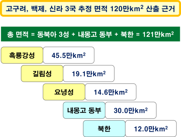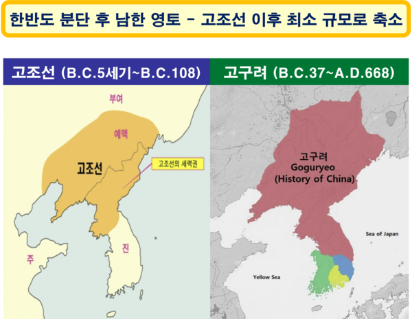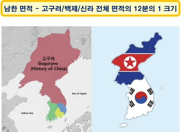 고구려의 최전성기 국토 면적을 기준으로 보면 미국의 한반도 양분 이후 남한의 면적은 고구려, 백제, 신라 등 3국 전체 면적인 120만km2(추정)의 12분의 1에 불과하다. (그림: 야후)
