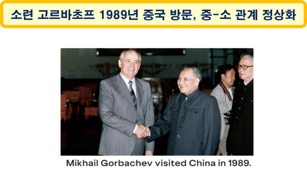 1989년 5월 소련 지도자 미하일 고르바초프가 중화인민공화국을 방문함으로써 중국-소련 사이의 오랜 대립에 종지부를 찍었다. 중-소 관계의 정상화는 한-중 수교(1992)의 중요한 계기가 되기도 하였다.
