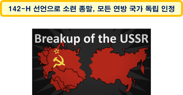 소련의 붕괴는 대통령 사임 다음 날인 1991년 12월 26일 소련 최고 소비에트의 142-Н 선언으로 공식화되었다. 이 선언문은 모든 소련 연방국가들의 독립을 인정하고, 독립국가연합(Commonwealth of Independent States; CIS) 수립을 허용하는 안이었다. (이상 원문 : 위키백과)