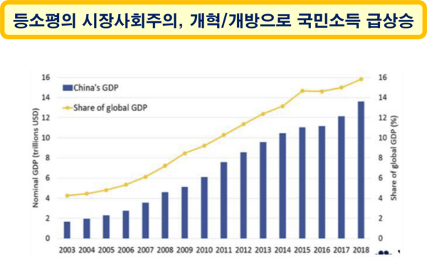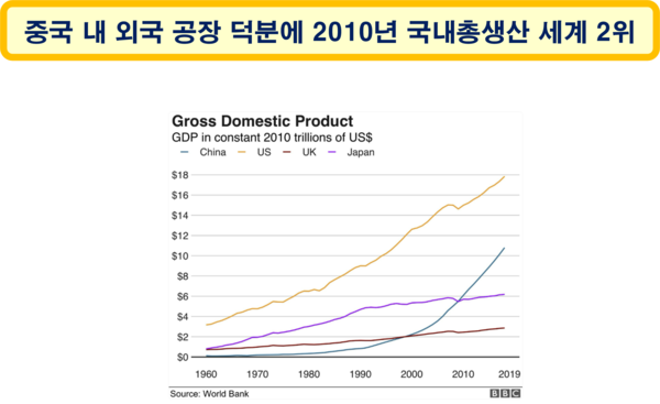 저임금에 의한 외국 공장들의 대대적인 중국 이전으로 2010년부터 중국의 세계 명목 GDP(국내총생산) 순위는 2위가 되었고, 2018년에는 중국 경제 규모가 13조 5천억 달러에 달했다.