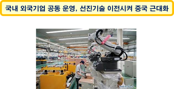 1979년 7월 1일의 제5기 전국인민대표대회 제2회 회의에 중외합자경영기업법이 발표되어 외국기업이 중국에 사업을 하는 경우 중국과 반드시 합자법인을 만들어야 하고, 외국기업이 선진기술과 설비를 제공해야 하기 때문에 선진기술이 없던 중국에서 기술 근대화가 가능하게 되었다.