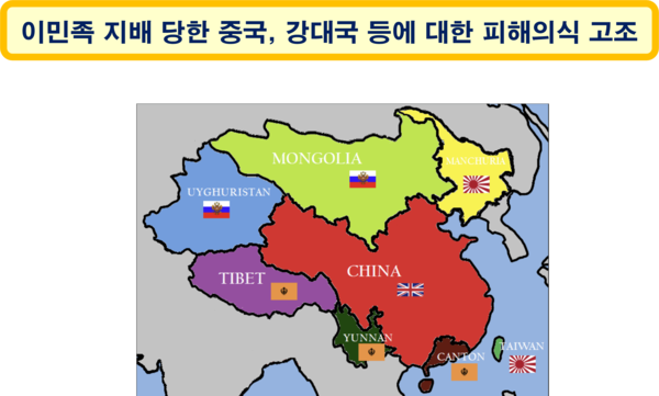 원나라 몽골족의 중국 지배(1279~1368), 청나라 만주족[여진족]의 중국 지배(1644~1912), 제1차 아편전쟁 이후 영국의 홍콩 지배(1842~1977), 일본의 만주 지배(1932~1945) 등 5천년 역사에 500년 이상 영토의 전부 또는 일부가 이민족의 식민지 또는 점령지가 되었던 한족 중심의 중국은 이민족과 강대국에 대한 피해의식과 위기의식에 사로잡히게 되었다.