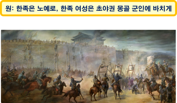중국 한족의 이민족 몽골족에 대한 고통스러운 기억도 무시할 수 없다. 원나라 몽골족이 남송(南宋)을 정복하는 과정에서 대부분의 한족들은 목숨을 잃거나 노예로 전락하였고, 원나라가 중국 대륙을 정복한 후에도 한족 여성들은 결혼할 때 신랑과 잠자리를 해야 하는 초야권(初夜權)을 몽골 군인들에게 바쳐야 했다.