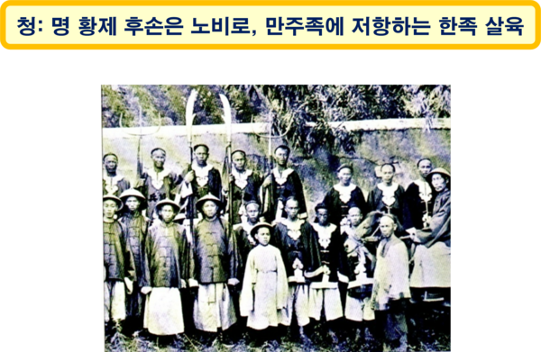 중국 대륙을 정복한 청나라 만주족은 명나라 마지막 황제인 숭정제(崇禎帝)의 후손들을 모아 노비로 삼았다. 명나라에 충성을 고집하는 고관들은 모두 목을 베어 거리에 시체가 즐비했다. 만주족을 섬기는 한족들은 살려주었지만 만주족에게 저항하는 한족들은 모두 살육하였다.