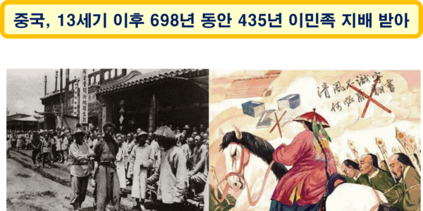 원나라 몽골족의 중국 지배가 시작된 1279년부터 영국의 홍콩 지배가 끝난 1977년까지 698년 동안, 원나라의 중국 지배 89년, 청나라의 중국 지배 268년, 영국의 홍콩 지배 65년(1912~1977), 일본의 만주 지배 13년 등 총 435년을 영토의 전부 또는 일부가 이민족의 지배를 받았다는 사실은 세계 역사에 보기 드문 일이다.