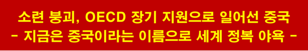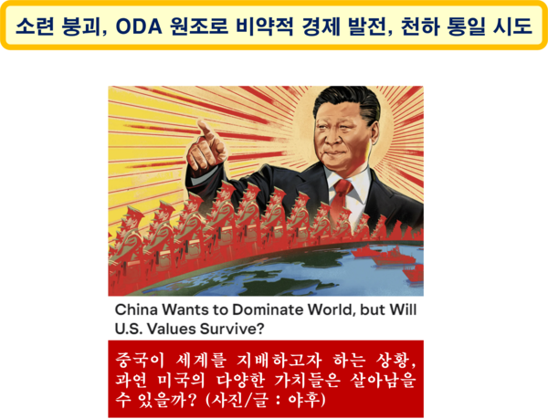 소련연방 해체(1991)로 중국은 소련이라는 부담에서 벗어날 수 있었고, 미국, 일본, EU, 캐나다, 호주, 한국 등 경제 선진 국가들의 막대한 공적개발원조(ODA) 덕분에 지원받은 자금과 기술을 기반으로 엄청난 경제발전을 이룰 수 있었다. 지금은 미국과 경쟁과 대립을 반복하며, 세계를 중국이라는 이름으로 통일하려고 하고 있다. 특히 미국, 일본, 독일, 영국, 프랑스, 캐나다, 호주, 한국 등이 자국의 자본과 기술로 중국을 경제 대국으로 만들었다고 해도 과언이 아니지만, 지금까지 이들 나라들은 세계 정복을 꿈꾸는 중국으로부터 가장 큰 고통을 받고 있다.