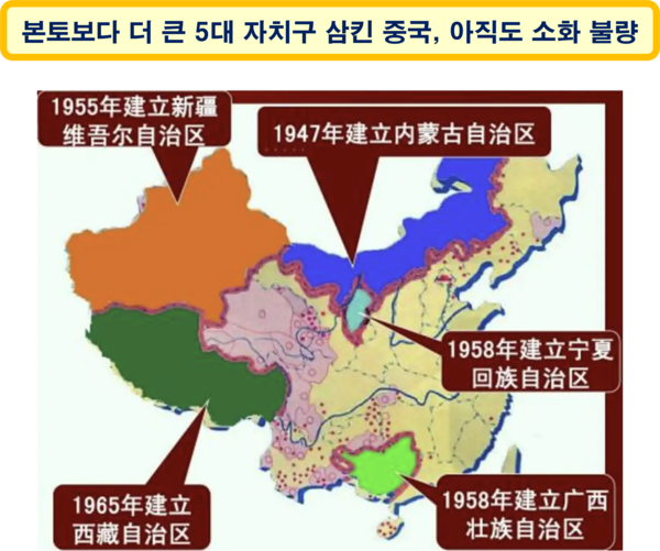 거대한 뱀이 악어를 삼킨 후 악어가 자신을 삼킨 뱀의 몸을 뚫고 밖으로 나오는 바람에 뱀이 죽게 되었다는 일화는 중국에 시사하는 바가 크다. 중국이 삼킨 5대 자치구는, 중국 본토 면적의 약 1.2배로, 아직도 충분히 소화되지 않은 상태이다.