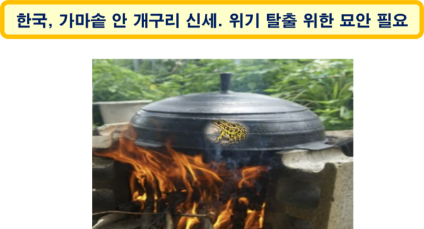 어찌 보면 한국은 미지근한 물로 채워진 가마솥 안에서 무심하게 헤엄치는 개구리와 같은 처지일지도 모른다. 마른 장작으로 가마솥을 가열한다면 개구리의 운명은 불 보듯 뻔하다. 지금의 한국은 50g의 개구리가 5kg의 가마솥 뚜껑을 열고 탈출해야 하는 지혜가 필요한 위기 상황일 수 있다.